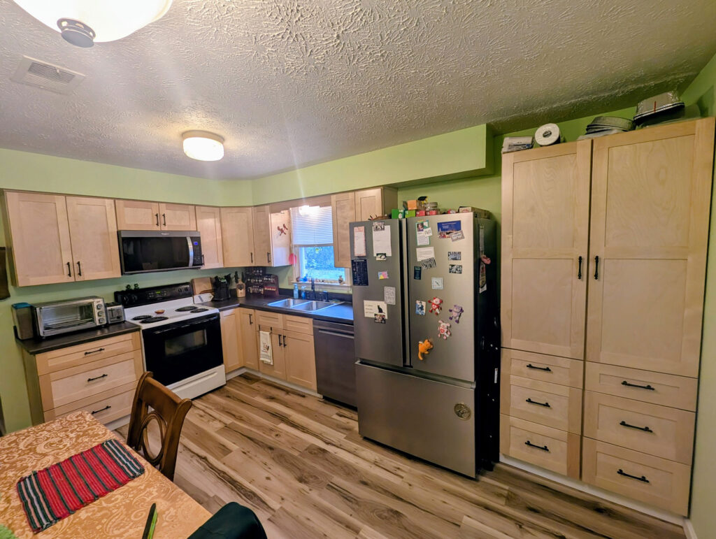 Here is what the cabinets look like with a clear finish. I wish I had more details on the product used. I only know it was clear and no stain. They used two of our PC3DB pantry cabinets and mounted the doors opposite to give a larger 36″ feel to the pantry. Each are 18″. We stock this popular 3-drawer pantry in 2 sizes, 18″, 24″ and soon we will have it in 30″ too!